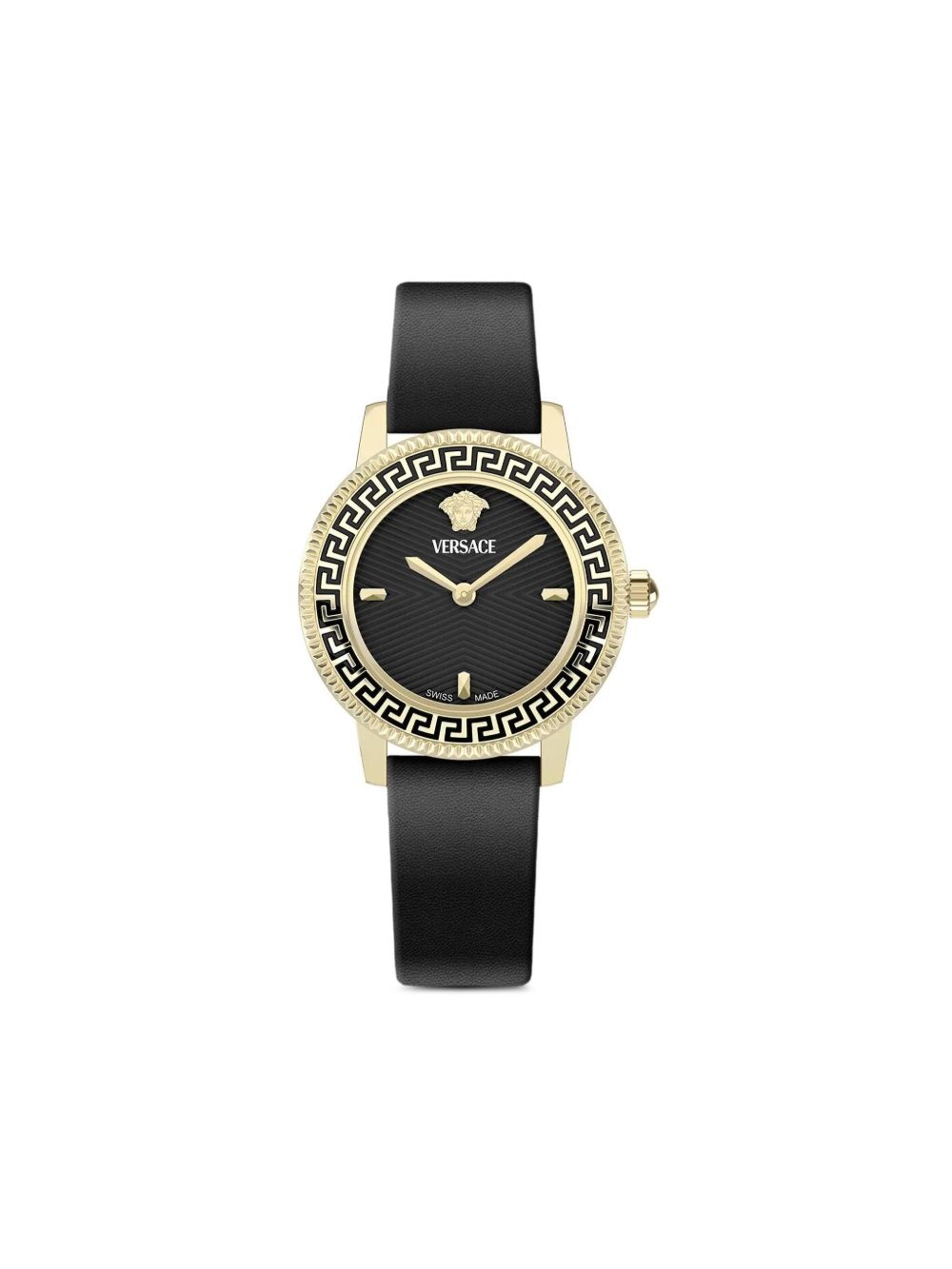 V-Tribute 30mm Highlights - 30mm - Stainless steel - Black - Quartz movement - Round face - Geometric dial - Baton hands - Screw-down crown - Signature greca detailing - Medusa head motif - Leather bracelet - Buckle fastening - This item comes with a standard one-year warranty from the boutique. Imported SIZE & FIT Measurement DIAMETER 1.18 in(3 cm)