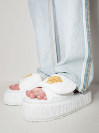 Medusa Head platform slippers In line with the brand's Italian sleek aesthetic, Versace presents these striking platform slippers. Adorned with the house's printed logo in full jacquard and featuring their cherished Medusa Head motif, the lofty platform sole injects bold confidence in the pair. Made in Italy Composition Outer: Fabric 100% Lining: Fabric 100% SIZE & FIT Model measurements Height 5 ft 11 in(1.81 m) Bust/Chest 29.52 in(75 cm) Hips 34.64 in(88 cm) Waist 23.22 in(59 cm) FittingInformation This piece fits true to size. We recommend you get your regular size