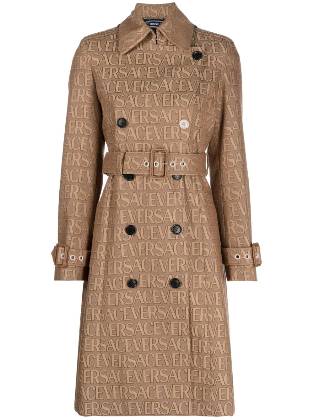 Versace Allover-jacquard trench coat The Versace Allover trench coat is an example of the brand’s exquisite crafting techniques. Covered by a jacquard pattern canvas with the logo, this piece is detailed by a reversible leather belt, merging a classic silhouette with a rougher vibe. Highlights - Camel brown - Canvas - Jacquard logo motif - Leather trim - Signature la greca print - Full lining - Notched collar - Double-breasted button fastening - Long sleeves - Belted cuffs - Two side slit pockets - Detachable and adjustable waist belt - Central rear vent - Straight hem - Knee-length Made in Italy Composition Outer: Lamb Skin 100%, Polyester 60%, Cotton 40% Lining: Cupro 100% SIZE & FIT Model measurements Height 5 ft 10 in(1.77 m) Bust/Chest 32.28 in(82 cm) Hips 35.03 in(89 cm) Waist 25.19 in(64 cm) Measurement SLEEVE LENGTH 17.71 in(45 cm) LENGTH 40.35 in(102.5 cm) WAIST 33.85 in(86 cm) BUST 35.43 in(90 cm) FittingInformation Designed to be unstructured, offering a loose fit throughout The belt offers adjustability for fitted preferences Made from a midweight non-stretch fabric This piece fits true to size – take your usual size