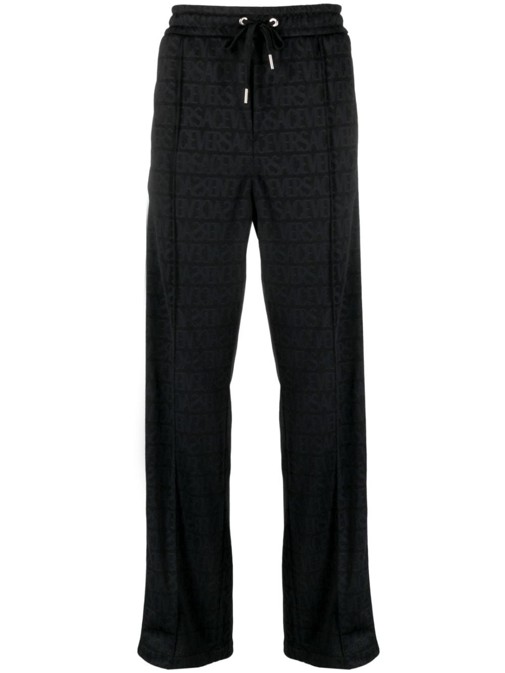 Versace Allover pattern track pants Versace Allover pattern takes the focus of these black track pants from the brand's AW23 collection. The casual style is crafted from cotton and also highlighted by a side stripe on the sides. Highlights - Black - Cotton - Signature versace allover pattern - Side stripe detailing - Drawstring fastening waist - Rear welt pocket - Straight leg Made in Italy Composition Outer: Polyester 100% Lining: Cotton 100% SIZE & FIT Model measurements Height 6 ft 2 in(1.88 m) Bust/Chest 37.79 in(96 cm) Hips 35.82 in(91 cm) Waist 29.92 in(76 cm) FittingInformation Designed for a straight-leg, allowing for an unrestricted and comfortable fit over the leg Adjust this piece’s waistband to your preference using the drawstring Made from a midweight non-stretch fabric, this piece offers minimal elasticity when worn This piece fits true to size – take your usual size