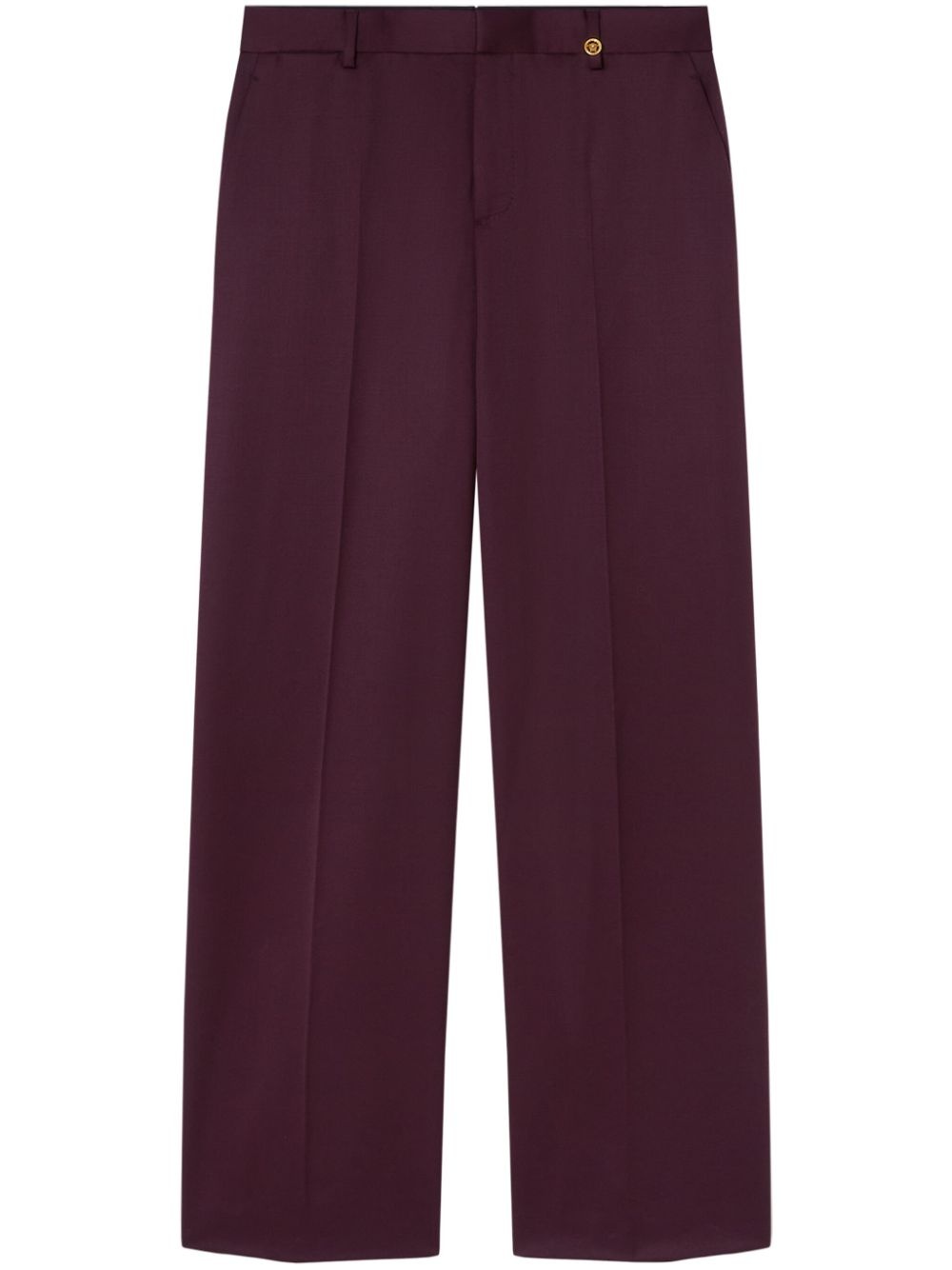 wide-leg tailored trousers Highlights - Burgundy - Wide leg - Tailored cut - Hook and zip fly fastening - Belt loops - Signature medusa head rivet detailing - Pressed crease - Two side slash pockets - Applique logo - Two rear welt pockets - Straight hem Made in Italy Composition Wool 99%, Spandex/Elastane 1%