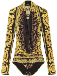 Wild Barocco silk draped bodysuit Highlights - Cedar brown - Banana yellow - Silk - Stretch-design - Signature barocco print - All-over leopard print - V-neck - Long sleeves - Just a reminder that this piece must be tried on over your own garments. Made In Italy Composition Outer: Silk 94%, Elastane 6% Lining: Viscose 100%
