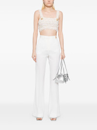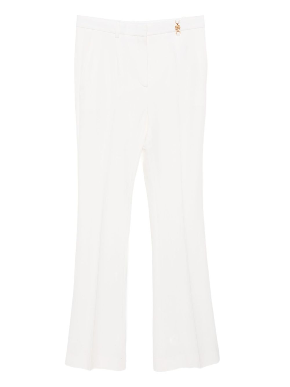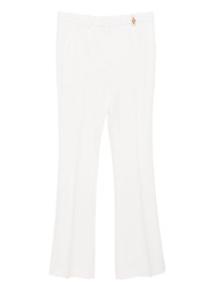 wool trousers Highlights - Ivory - Concealed front button, hook and zip fastening - Two side seam pockets - Two rear welt pockets - Gold chain detail Made in Italy Composition Outer: Wool 100% Lining: Cupro 100% SIZE & FIT Model measurements Height 5 ft 9 in(1.76 m) Bust/Chest 31.1 in(79 cm) Hips 35.03 in(89 cm) Waist 24.4 in(62 cm) FittingInformation Designed with a flared hem, these trousers allow for a close fit at the waist with a slim fit over the leg and widening towards the hem Made from a midweight non-stretch fabric This piece fits large – take one size down