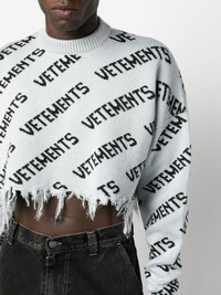 frayed-hem intarsia-knit jumper Highlights - White/black - Knitted construction - Intarsia-knit logo - Cropped - Crew neck - Drop shoulder - Long sleeves - Ribbed trim - Frayed hem - When buying this unisex item, keep in mind that it is graded in standard men's sizing. Made in Italy Composition Viscose 52%, RWS Merino Wool 33%, Polyester 15% SIZE & FIT Model measurements Height 6 ft 0 in(1.84 m) Bust/Chest 35.82 in(91 cm) Hips 37 in(94 cm) Waist 28.34 in(72 cm) FittingInformation Designed to be unstructured, offering a loose fit throughout This unisex piece is designed for a loose fit whether you usually select women's or men's sizes Made with a midweight knit, this piece offers some stretch Made with a midweight knit, this piece offers some stretch This piece fits true to size – take your usual size