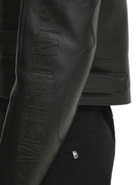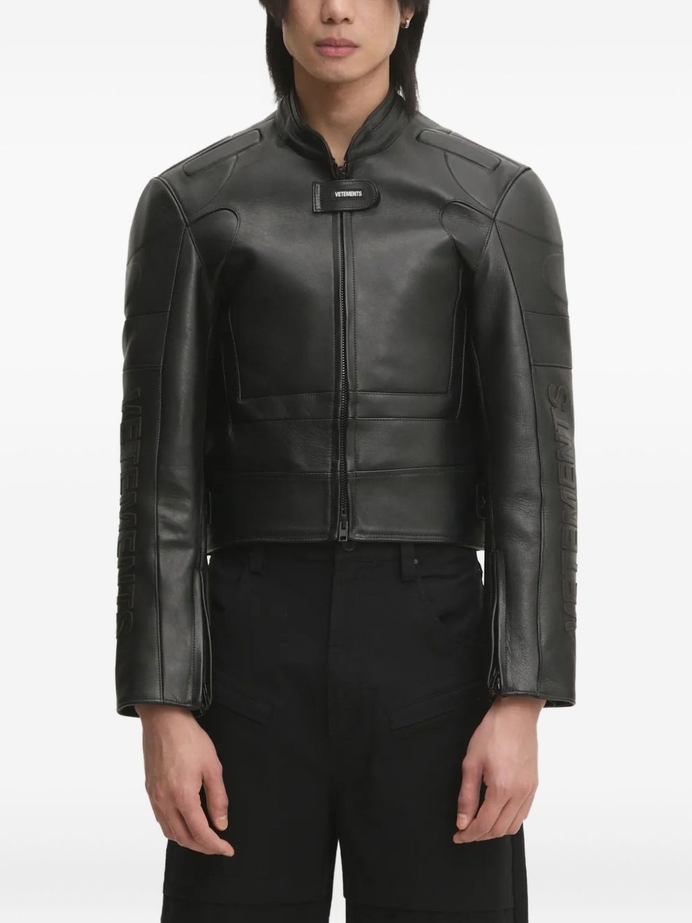 logo-embossed leather jacket Highlights - Black - Leather - Embossed logo detail - Zip fastening - Stand-up collar Made in Italy Composition Outer: Calf Leather 100% Lining: Polyester 100%, Viscose 100%, Polyamide 83%, Elastane 17% Washing instructions Specialist Cleaning