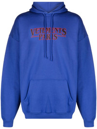 logo-print cotton hoodie Rendered in a royal hue, this drawstring hoodie by Vetements is detailed with the brand's logo print at the chest – bringing contrast to the oversize silhouette. Highlights - Royal blue - Cotton blend - Logo print at the chest - Drawstring hood - Front pouch pocket - Drop shoulder - Long sleeves - Ribbed cuffs and hem - When buying this unisex item, keep in mind that it is graded in standard men's sizing. Imported Composition Cotton 80%, Polyester 20% SIZE & FIT Model measurements Height 5 ft 10 in(1.77 m) Bust/Chest 29.92 in(76 cm) Hips 34.25 in(87 cm) Waist 23.62 in(60 cm) FittingInformation This piece is unisex – if you usually select men's sizing expect a loose fit throughout; if you usually select women's sizes, expect an oversized fit Made with a midweight knit, this piece offers some stretch This piece fits true to size – take your usual size Washing instructions Machine Wash