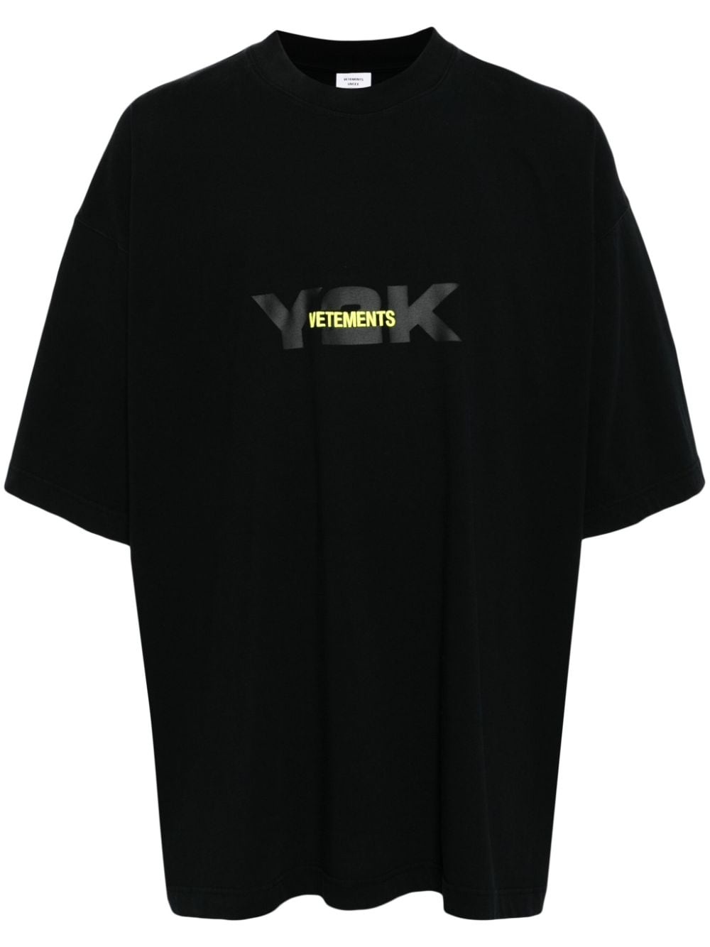 logo-print cotton T-shirt Vetements' clothes often incorporate elements of streetwear and popular culture. As seen in this black T-shirt, which boats a relaxed design enhanced with a contrasting slogan-print at the rear in a silver-tone. Highlights - Black - Cotton - Logo print at the chest - Slogan print to the rear - Round neck - Drop shoulder - Short sleeves - Straight hem - When buying this unisex item, keep in mind that it is graded in standard men's sizing. Imported Composition Body: Cotton 100% SIZE & FIT Model measurements Height 5 ft 10 in(1.77 m) Bust/Chest 31.49 in(80 cm) Hips 35.43 in(90 cm) Waist 25.19 in(64 cm) FittingInformation This unisex piece is designed for an oversized fit whether you usually select women's or men's sizes Made from a midweight non-stretch fabric, this piece offers minimal elasticity when worn