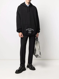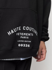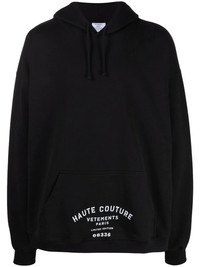 logo-print oversized hoodie Vetements' forte is the art of reworking wardrobe staples. Made from a cotton-blend and cut for an oversized fit, this relaxed hoodie has been branded with a stamp, complete with logo, 'Haute Couture' lettering and edition number. Imported Composition Cotton 80%, Polyamide 20% SIZE & FIT Model measurements Height 5 ft 10 in(1.79 m) Bust/Chest 33.07 in(84 cm) Hips 35.82 in(91 cm) Waist 24.01 in(61 cm) Measurement CHEST 52.75 in(134 cm) Shoulder Width 26.77 in(68 cm) FittingInformation This piece fits true to size. We recommend you get your regular size Cut for a loose fit Made with a mid-weight fabric Washing instructions Machine Wash