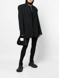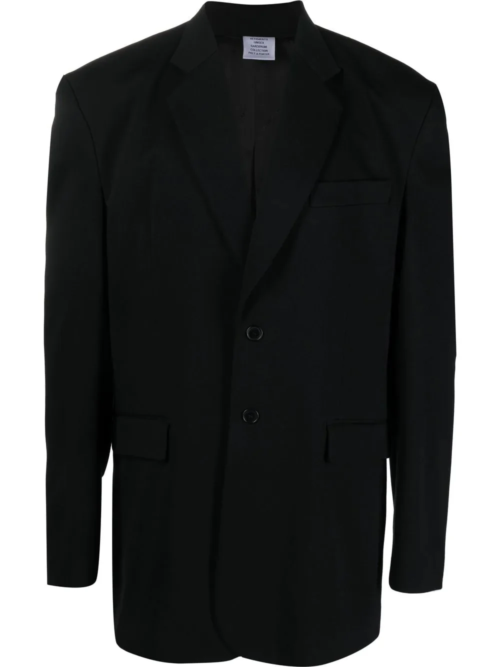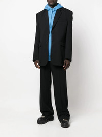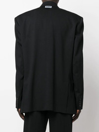 oversize single-breasted blazer black cotton blend logo patch to the rear front button fastening notched lapels chest welt pocket two front flap pockets long sleeves buttoned cuffs English rear vents Made in Italy Composition Outer: Cotton 80%, Polyester 20% Lining: Viscose 100% SIZE & FIT Model measurements Height 5 ft 11 in(1.8 m) Bust/Chest 33.07 in(84 cm) Hips 37.4 in(95 cm) Waist 25.19 in(64 cm) FittingInformation This piece fits true to size. We recommend you get your regular size Cut for an oversized fit Made with a mid-weight fabric Washing instructions Machine Wash