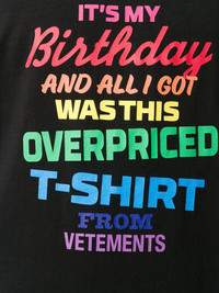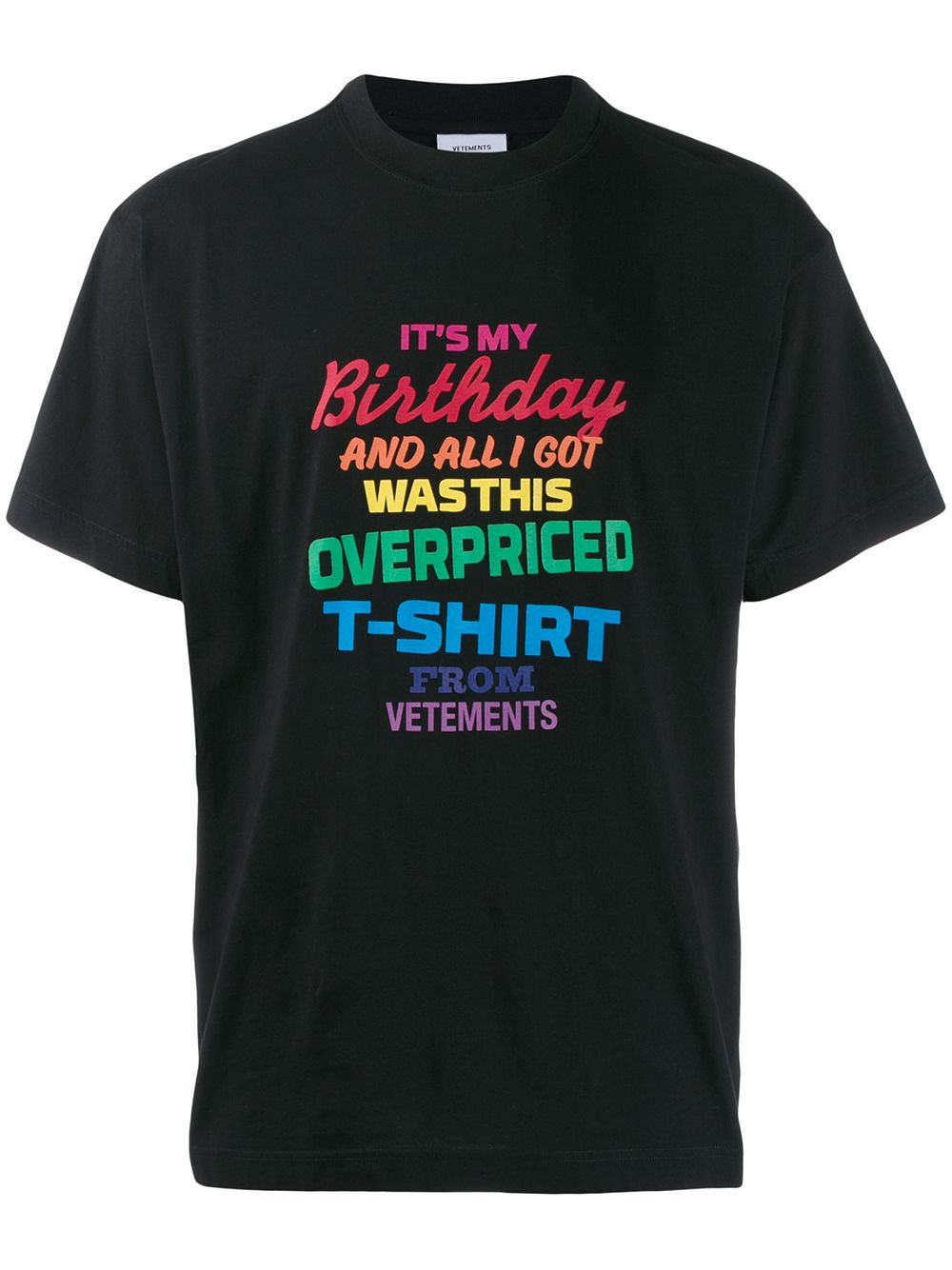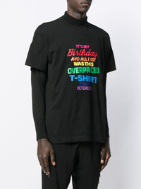 rainbow slogan T-shirt Black cotton rainbow slogan T-shirt from Vetements featuring a round neck, short sleeves and a straight fit. Imported Composition Cotton 100% SIZE & FIT Model measurements Height 6 ft 2 in(1.87 m) Bust/Chest 36.41 in(92.5 cm) Hips 37 in(94 cm) Waist 29.52 in(75 cm) FittingInformation This piece fits true to size. We recommend you get your regular size Cut for a relaxed fit Washing instructions Machine Wash