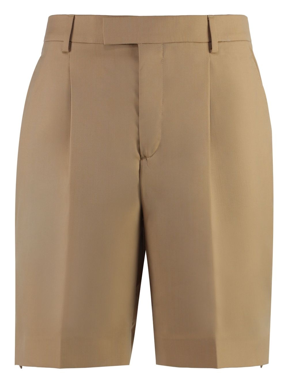 virgin wool bermuda shorts Highlights - Caramel brown - Concealed front button, hook and zip fastening - Belt loops - Slip pockets to the sides - Two rear welt pockets Made in Italy Composition Lining: Viscose 100% Outer: Virgin Wool 100%