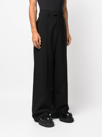 wide-leg tailored trousers jet black virgin wool blend logo patch to the side concealed front button fastening concealed front zip fastening belt loops two diagonal pockets to the sides two rear welt pockets Imported Composition Outer: Virgin Wool 93%, Elastane 4%, Polyamide 3% Lining: Viscose 100% SIZE & FIT Model measurements Height 6 ft 2 in(1.87 m) Bust/Chest 38.18 in(97 cm) Hips 36.61 in(93 cm) Waist 29.13 in(74 cm) FittingInformation This piece fits true to size. We recommend you get your regular size Designed for a slim fit at the waist and loose over the leg Made with a mid-weight stretch fabric Washing instructions Dry Clean Only