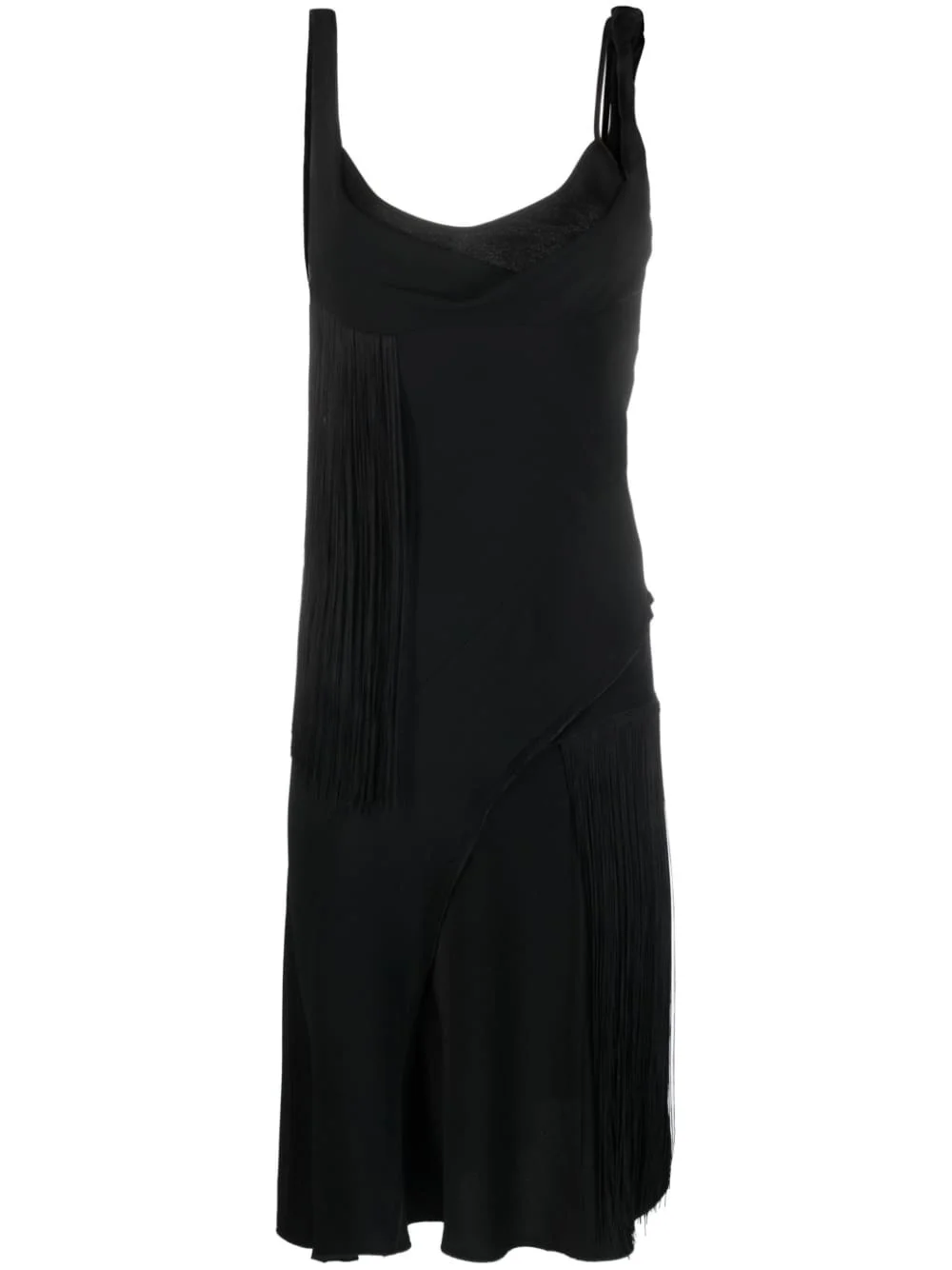 asymmetric fringed slip dress Victoria Beckham's signature minimalist aesthetic is elevated in this black midi dress. Cut to an asymmetric design, it's characterised by tonal draping throughout, trimmed with tonal fringing that lends a playful yet understated look. Made in United Kingdom Composition Acetate 71%, Viscose 29% SIZE & FIT Model measurements Height 5 ft 10 in(1.78 m) Bust/Chest 30.7 in(78 cm) Hips 34.64 in(88 cm) Waist 23.22 in(59 cm) Measurement HIPS 29.92 in(76 cm) WAIST 24.4 in(62 cm) FittingInformation Designed for a slim fit that sits just away from the body offering a close yet comfortable fit Made from a midweight non-stretch fabric Washing instructions Dry Clean Only
