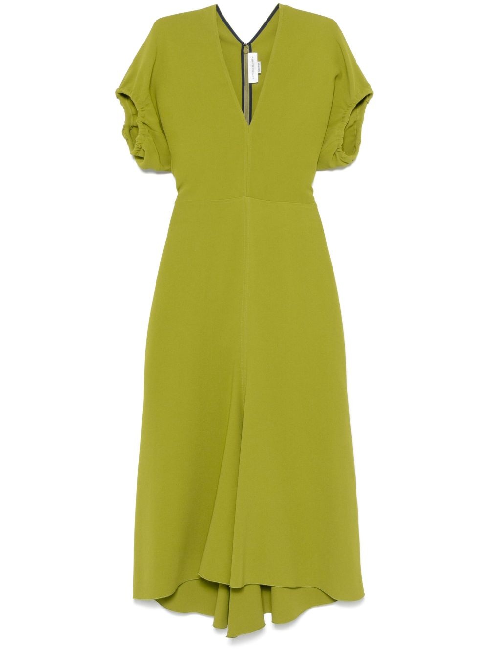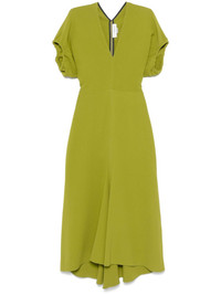 crepe midi dress Highlights - Parakeet green - Concealed rear hook and zip fastening - V-neck - Short sleeves - Unlined Imported Composition Viscose 50%, Acetate 47%, Elastane 3% SIZE & FIT Model measurements Height 5 ft 9 in(1.75 m) Bust/Chest 34.64 in(88 cm) Hips 36.61 in(93 cm) Waist 26.37 in(67 cm) FittingInformation Designed for a loose fit at the chest with a close fit over the waist and hips Made from a midweight stretch fabric, this piece offers elasticity and flexibility when worn