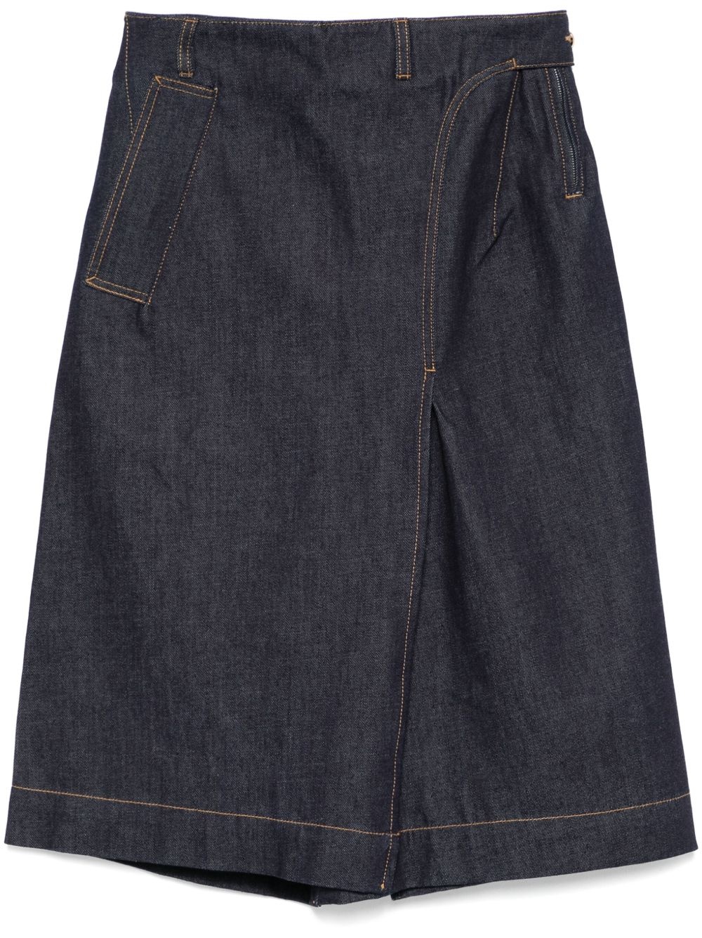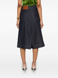 denim midi skirt Highlights - Indigo blue - Side button and zip fastening - Side welt pocket - Front slit - Two rear patch pockets Made in Italy Composition Outer: Cotton 100%, Leather 100% Lining: Polyester 65%, Cotton 35% SIZE & FIT Model measurements Height 5 ft 10 in(1.78 m) Bust/Chest 32.67 in(83 cm) Hips 35.43 in(90 cm) Waist 23.22 in(59 cm) FittingInformation This midi-length skirt is intended to be worn just below the waist The vented hem offers movement at the rear Sturdy and hard-wearing, this denim piece offers no stretch