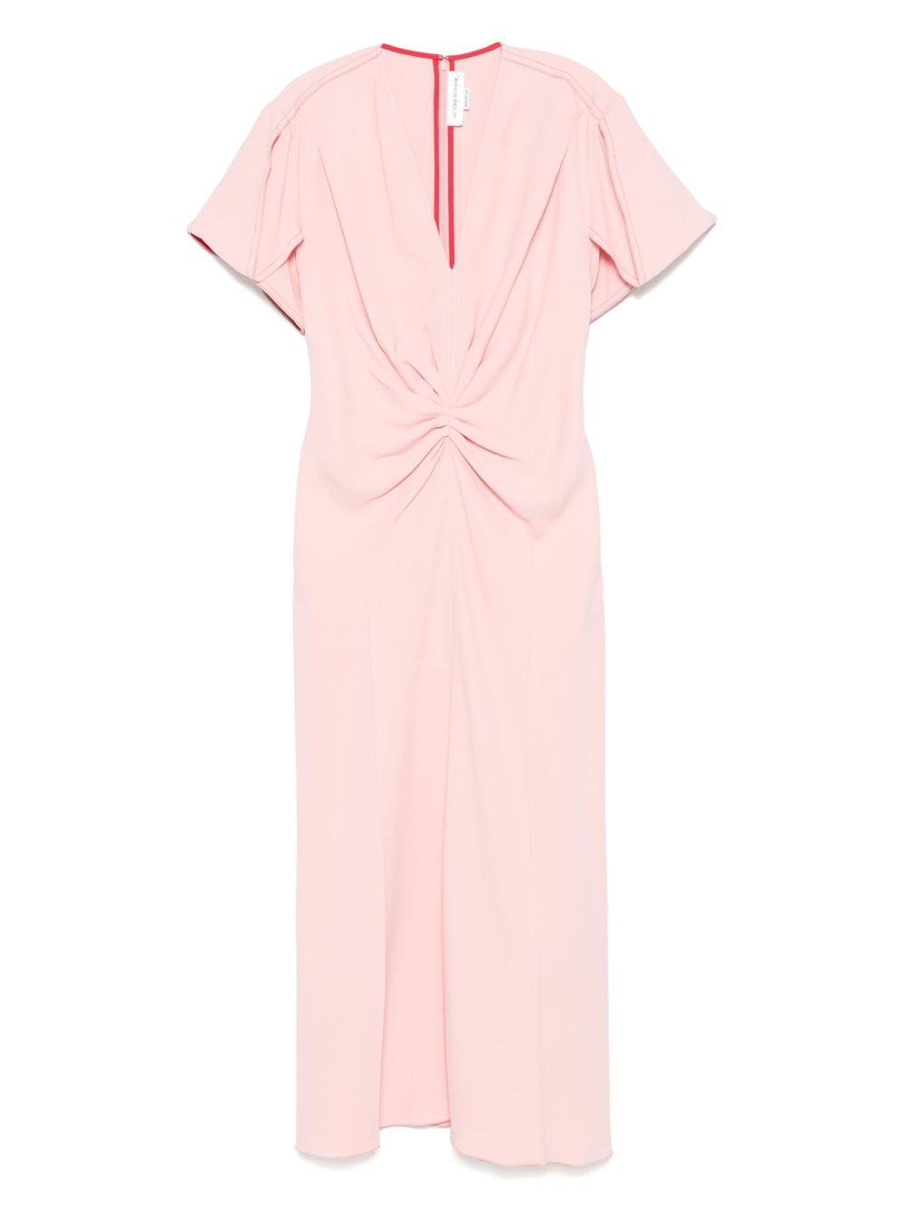 gathered dress Highlights - Pink - Rear zip fastening - V-neck - Short sleeves - Mid-length Imported Composition Viscose 50%, Acetate 47%, Elastane 3% SIZE & FIT Model measurements Height 5 ft 9 in(1.75 m) Bust/Chest 32.67 in(83 cm) Hips 36.22 in(92 cm) Waist 24.8 in(63 cm) FittingInformation Designed for a slim fit that sits just away from the body offering a close yet comfortable fit Made from a midweight stretch fabric, this piece offers elasticity and flexibility when worn
