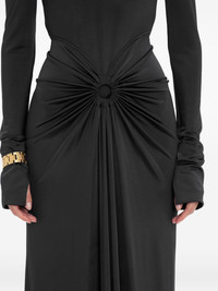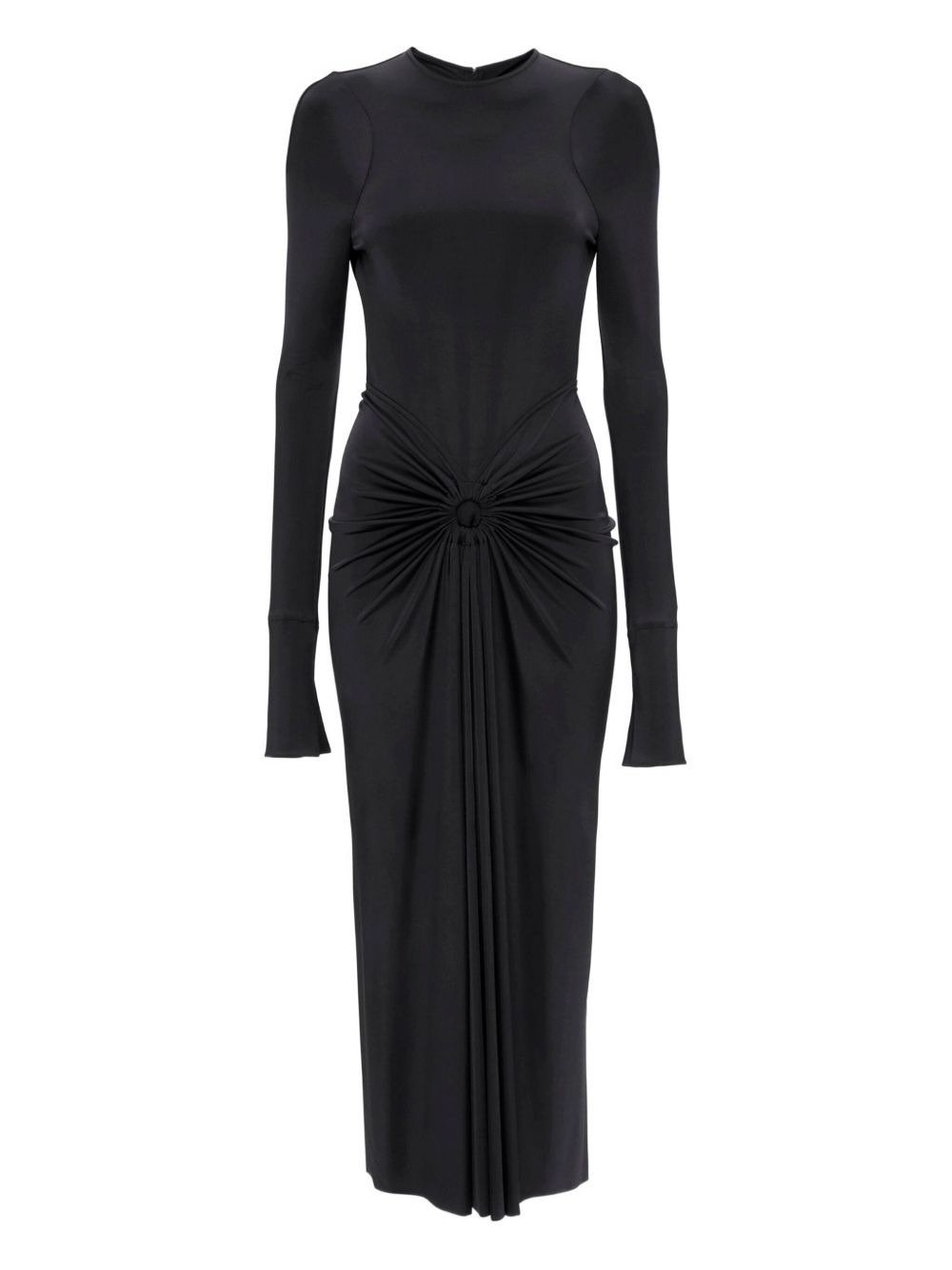 gathered long-sleeve midi dress Highlights - Black - Gathered waist detail - Ring detail - Long sleeves - Fitted bodice - Midi length Made in United Kingdom Composition Viscose 96%, Elastane 4% Washing instructions Read Manufacturer Guidelines