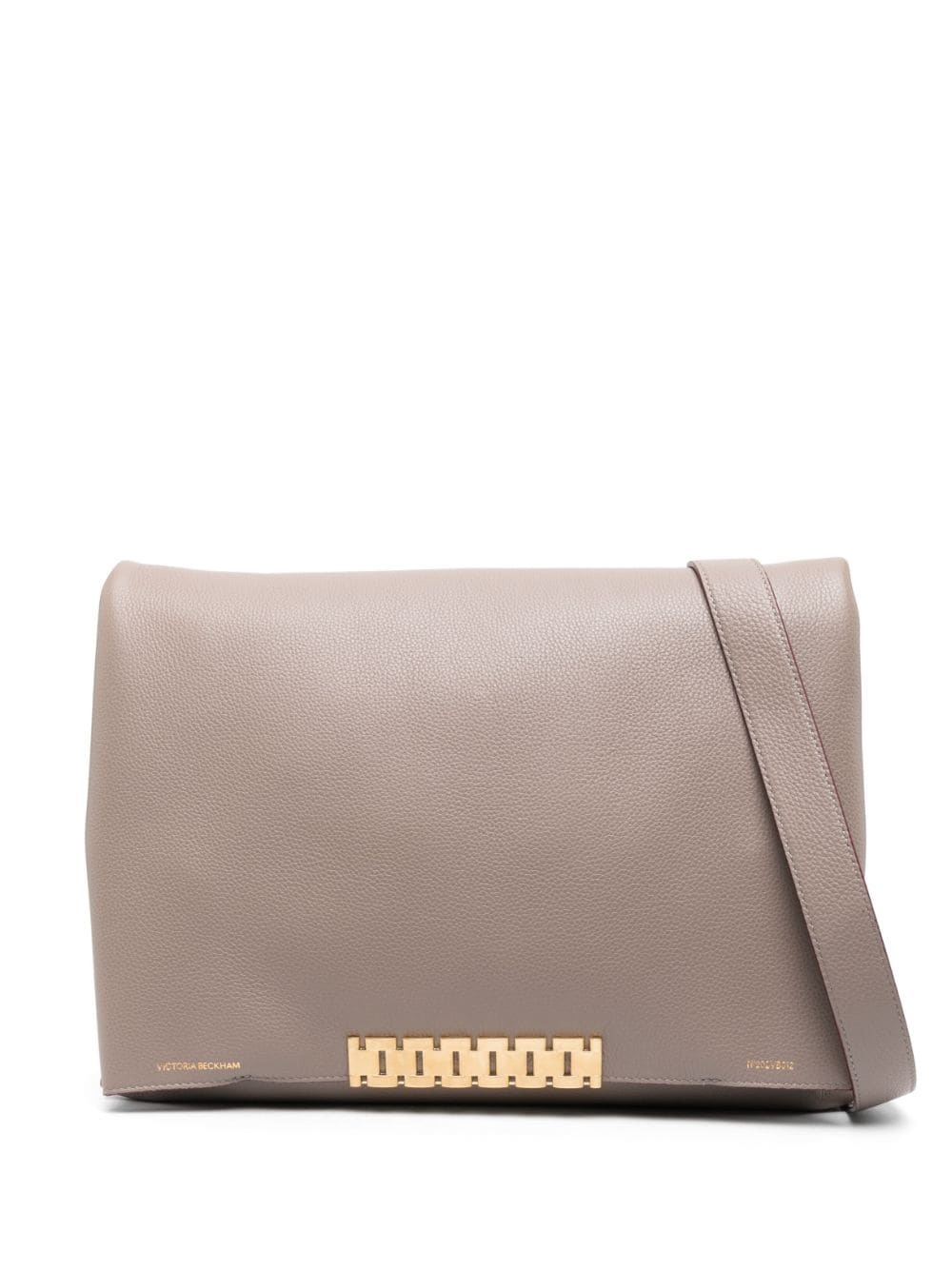 Jumbo Chain shoulder bag Victoria Beckham's penchant for understated yet refined accessories punctuates the brand's AW23 edit, as shown by this taupe grey iteration of the Jumbo Chain bag. Made in Italy from supple calf leather, it boasts a signature statement chain plaque at the front whilst benefiting from a spacious main compartment. Highlights - Taupe grey - Calf leather - Gold-tone hardware - Gold-tone logo lettering - Foldover top with magnetic fastening - Internal patch pocket - Internal logo patch Made in Italy Composition Outer: Calf Leather 100% SIZE & FIT Model measurements Height 5 ft 11 in(1.8 m) Bust/Chest 31.49 in(80 cm) Hips 36.61 in(93 cm) Waist 24.4 in(62 cm) Measurement DEPTH 5.51 in(14 cm) HANDLE 12.59 in(32 cm) HEIGHT 9.84 in(25 cm) WIDTH 13.77 in(35 cm)