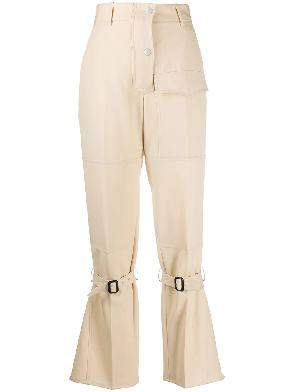 knee-strap flared trousers Skinny-fit trousers fatigue? Switch it up with these flared trousers and feel renewed - both you and your wardrobe. Victoria Beckham wants you to never feel bored. Highlights - Beige - Wool - Belt loops - High waist - Front button fastening - Flared - Front flap pocket - Buckle-fastening knee strap Made in United Kingdom Composition Lining: Polyester 65%, Cotton 35% Outer: Virgin Wool 100% SIZE & FIT Model measurements Height 5 ft 11 in(1.8 m) Bust/Chest 33.07 in(84 cm) Hips 37.4 in(95 cm) Waist 25.19 in(64 cm) Measurement INSIDE LEG 33.07 in(84 cm) HIPS 37.4 in(95 cm) WAIST 27.16 in(69 cm) FittingInformation This piece fits true to size. We recommend you get your regular size Designed to be fitted at the waist and through the thigh, loose from the knee Made with a mid-weight non-stretch fabric Washing instructions Dry Clean Only