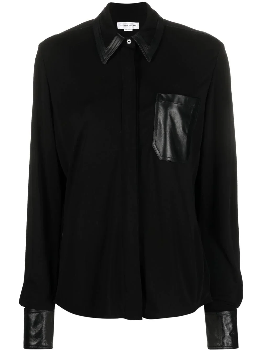 leather accent shirt Victoria Beckham is known for her refined silhouettes. Crafted in a tailored fit, this sophisticated shirt is given a unique twist with its leather trim collar, leather chest patch pocket and leather cuffs. Imported Composition Viscose 100%, Polyester 100%, Leather 100% SIZE & FIT Model measurements Height 5 ft 10 in(1.79 m) Bust/Chest 31.1 in(79 cm) Hips 35.03 in(89 cm) Waist 24.01 in(61 cm) FittingInformation This piece fits true to size. We recommend you get your regular size Cut for a loose fit Made with a mid-weight non-stretch fabric Washing instructions Specialist Cleaning