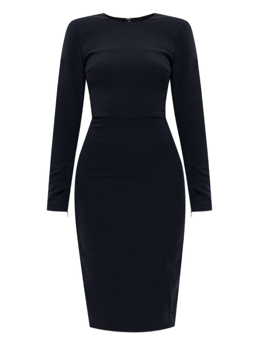 long-sleeve fitted dress Highlights - Navy blue - Round neckline - Long sleeves - Concealed zip fastening at the back - Knee-length design Imported Composition Polyester 54%, Wool 44%, Elastane 2%