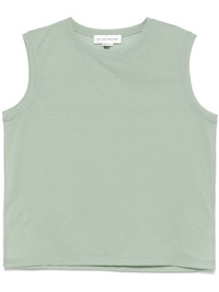 melange tank top Highlights - Sage green - Semi-sheer construction - Crew neck - Sleeveless Imported Composition Cotton 70%, Polyamide 30% SIZE & FIT Model measurements Height 5 ft 11 in(1.8 m) Bust/Chest 31.49 in(80 cm) Hips 35.82 in(91 cm) Waist 24.8 in(63 cm) FittingInformation Designed for a relaxed fit, this piece allows for comfort and movement when worn Made from a lightweight non-stretch fabric, this piece offers minimal elasticity when worn Washing instructions Machine Wash