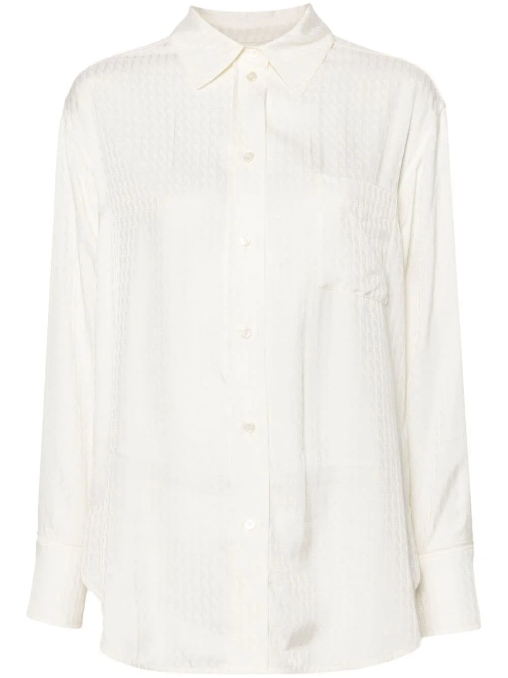 monogram shirt Highlights - Ivory white - Satin lining - Monogram jacquard - Pointed flat collar - Front button fastening - Drop shoulder - Long sleeves with buttoned cuffs - Chest patch pocket - Curved hem Imported Composition Viscose 65%, Modal 35% SIZE & FIT Model measurements Height 5 ft 10 in(1.78 m) Bust/Chest 31.49 in(80 cm) Hips 37 in(94 cm) Waist 23.62 in(60 cm) FittingInformation Designed to be unstructured, offering a loose fit throughout Made from a midweight non-stretch fabric This piece fits true to size – take your usual size Washing instructions Dry Clean Only