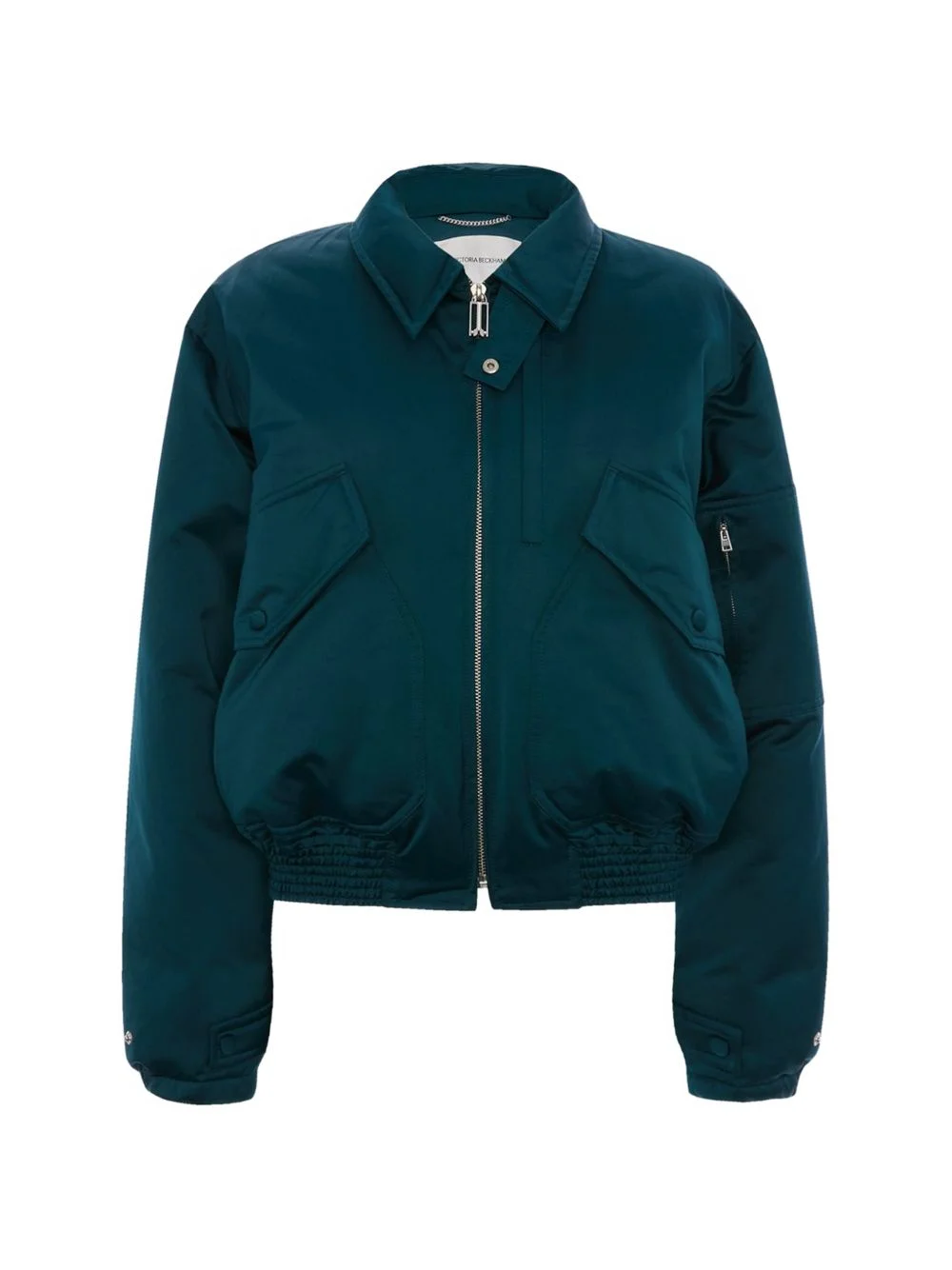 padded bomber jacket Highlights - Dark teal - Pockets - Zip fastening - Elasticated hem - Padded design - Collar Imported Composition Recycled Cotton 63%, Leather 37%