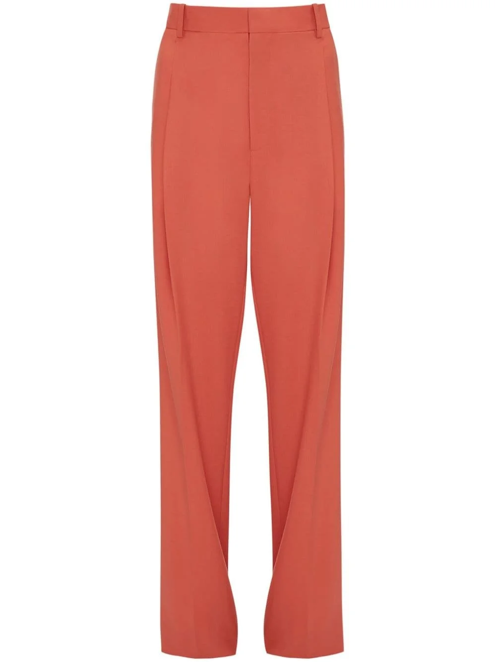 pleat-detail wide-leg trousers Highlights - Tangerine orange - Pleat detailing - Belt loops - Pressed crease - Mid-rise - Wide leg - Concealed front fastening - Two side slit pockets - Two rear welt pockets Imported Composition Polyester 53%, Wool 43%, Elastane 4% Washing instructions Dry Clean Only