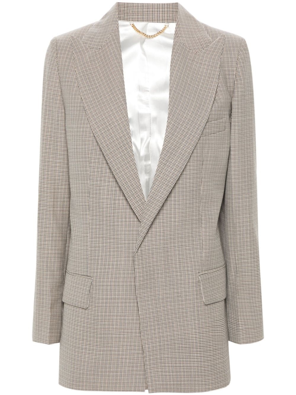 puppytooth peak-lapel blazer Highlights - Almond beige/multicolour - Virgin wool - Puppytooth pattern - Peak lapels - Shoulder pads - Long sleeves - Uncut buttonhole detailing at the cuffs - Chest welt pocket - Dart detailing - Two front flap pockets - Internal jetted pocket - Satin lining - Front button fastening Imported Composition Lining: Viscose 100%, Cotton 70%, Polyamide 30% Outer: Virgin Wool 100% SIZE & FIT Model measurements Height 5 ft 11 in(1.8 m) Bust/Chest 32.67 in(83 cm) Hips 36.22 in(92 cm) Waist 24.4 in(62 cm) FittingInformation Designed to be unstructured, offering a loose fit throughout The internal shoulder pads offer a structured shape Made from a midweight non-stretch fabric This piece fits true to size – take your usual size