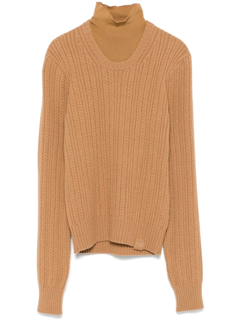 ribbed sweater Highlights - Camel brown - Wool blend - Ribbed knit - Cable knit detail - Layered details - High neck - Long sleeves - Straight hem Imported Composition Wool 94%, Cotton 5%, Polyamide 1% SIZE & FIT Model measurements Height 5 ft 9 in(1.75 m) Bust/Chest 31.88 in(81 cm) Hips 34.64 in(88 cm) Waist 24.01 in(61 cm) FittingInformation Designed for a slim fit that sits just away from the body offering a close yet comfortable fit The ribbed hem offers a close, comfortable fit Made with a midweight knit, this piece offers some stretch