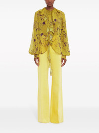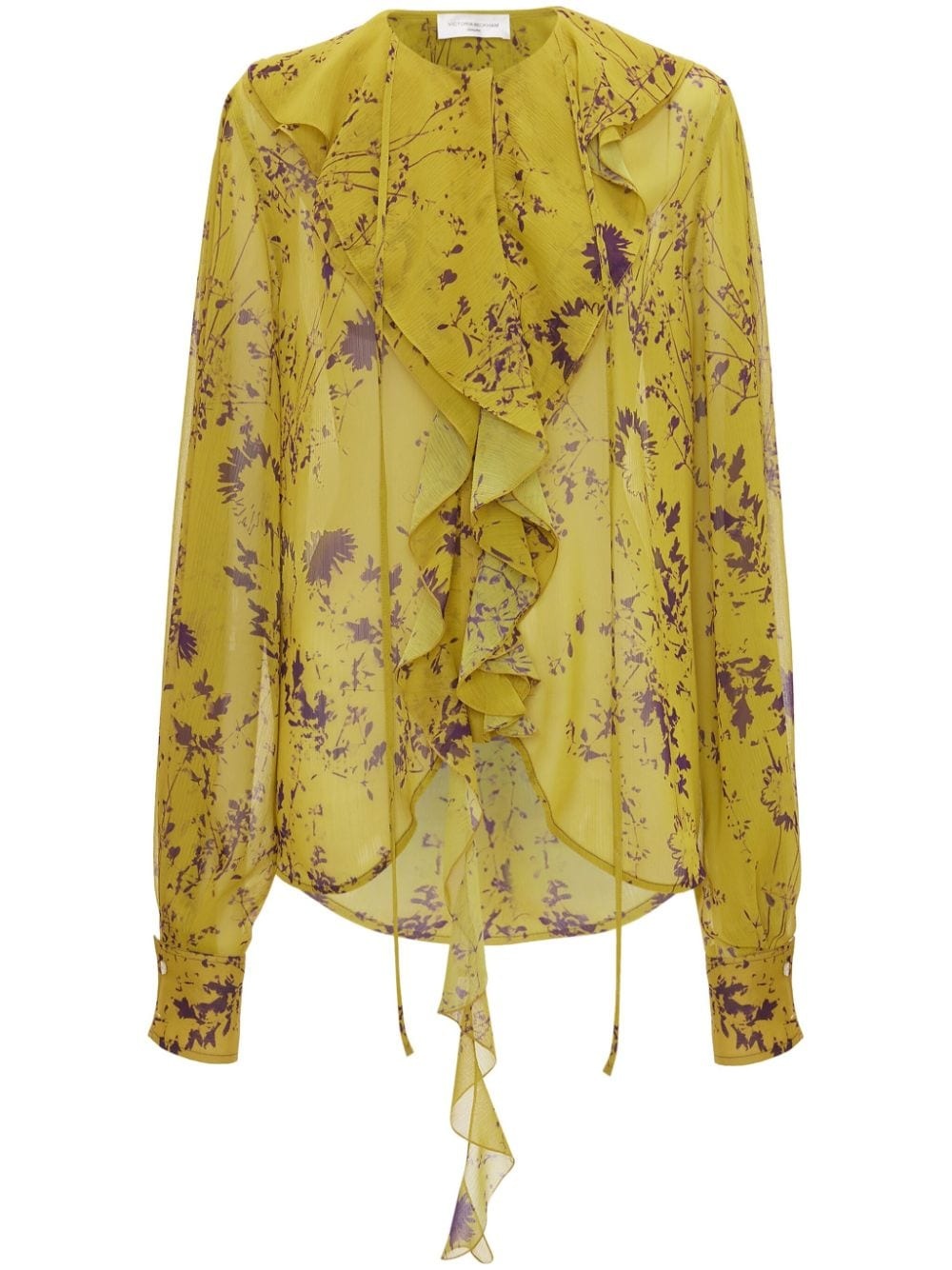 Romantic floral-print blouse This Romantic blouse from Victoria Beckham is peppered with a delicate floral print in a contrasting violet-purple hue. A ruffled neckline with tie and frill detailing lends the piece a sense of 'modern femininity'. Highlights - Ochre yellow - Silk - Ruffled detailing - Round neck - Long puff sleeves - Buttoned cuffs Imported Composition Silk 100% Washing instructions Read Manufacturer Guidelines
