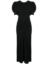 ruched-waist crepe midi dress Highlights - Black - Crepe texture - Ruched detailing at the waist - Seam detailing - Round neck - V-back - Split short draped sleeves - Fitted waistline - Slight flare - Straight hem - Mid-length Imported Composition Viscose 50%, Acetate 47%, Elastane 3% SIZE & FIT Model measurements Height 5 ft 10 in(1.77 m) Bust/Chest 31.1 in(79 cm) Hips 34.64 in(88 cm) Waist 24.8 in(63 cm) FittingInformation Designed for a slim fit that sits just away from the body offering a close yet comfortable fit Made from a midweight stretch fabric, this piece offers elasticity and flexibility when worn This piece fits true to size – if you would prefer a looser fit to layer, take one size up Washing instructions Dry Clean Only
