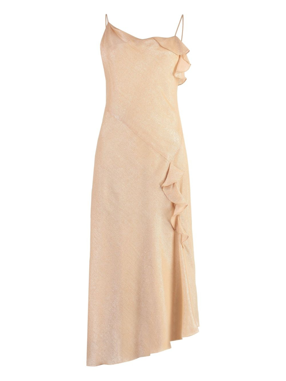 ruffle-detail asymmetrical dress Highlights - Beige - Lurex threads - Decorative ruffles - Asymmetric hem - Thin straps Made in United Kingdom Composition Viscose 82%, Polyamide 18% Washing instructions Read Manufacturer Guidelines