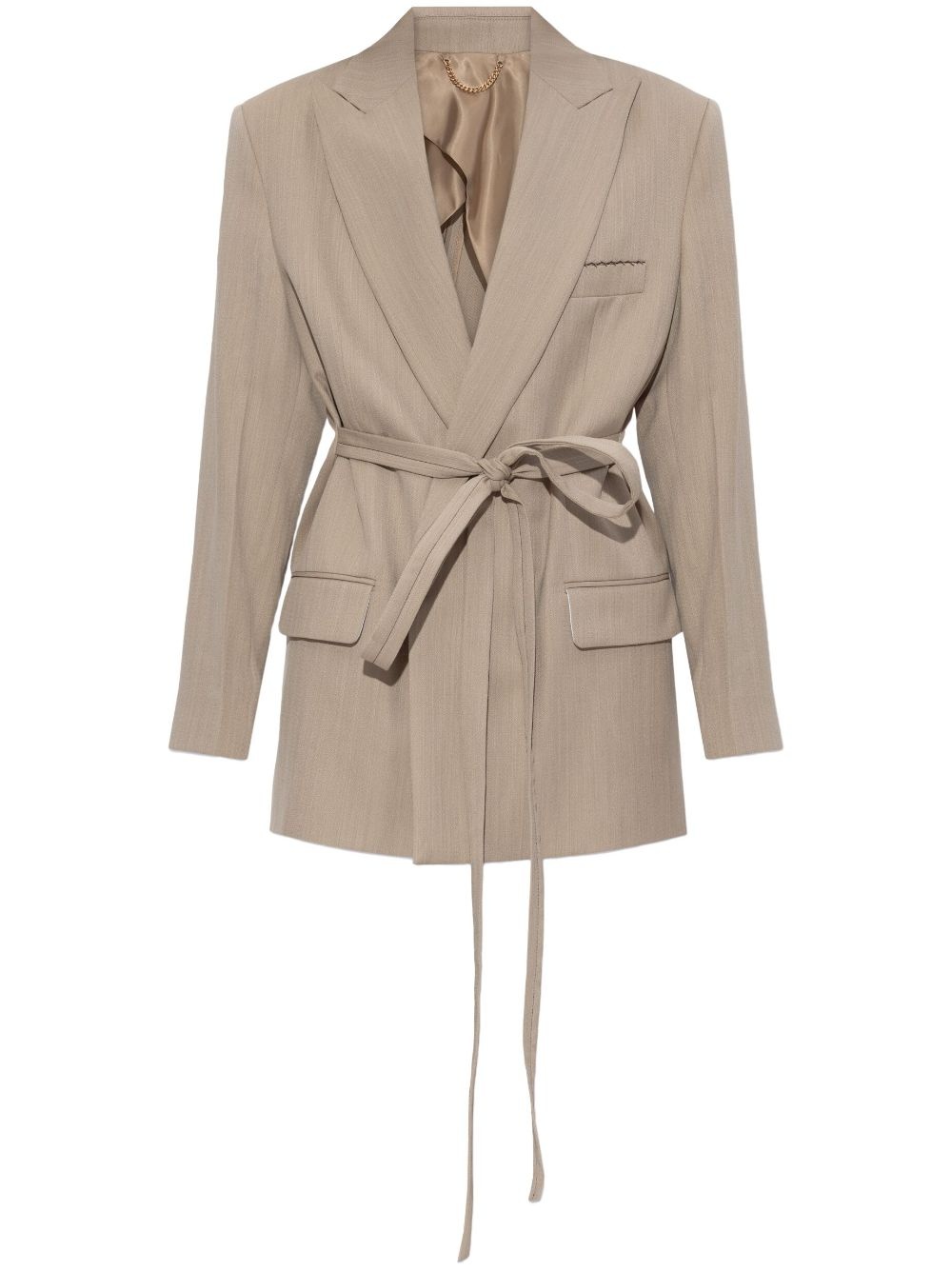 tied waist blazer Highlights - Beige - Tied waist - Chest welt pocket - Two front flap pockets - Peak lapels Imported Composition Wool 100% SIZE & FIT FittingInformation Designed to be unstructured, offering a loose fit throughout The tie fastening gives an adaptable and personalised fit Made from a midweight non-stretch fabric