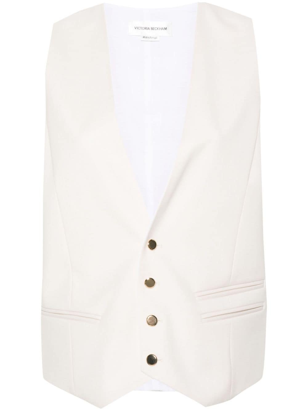 V-neck buttoned waistcoat Highlights - Bone white - Interlock twill weave - Dart detailing - Gold-tone buttons - V-neck - Front button fastening - Sleeveless - Adjustable strap to the rear - Three front jetted pockets - Straight hem Imported Composition Outer: Polyester 53%, Virgin Wool 43%, Elastane 4% Lining: Cotton 70%, Polyamide 30% SIZE & FIT Model measurements Height 5 ft 11 in(1.8 m) Bust/Chest 33.07 in(84 cm) Hips 37.4 in(95 cm) Waist 25.19 in(64 cm) FittingInformation Designed for a slim fit that sits just away from the body offering a close yet comfortable fit The adjustable tabs allow for fitted preferences Made from a midweight non-stretch fabric This piece fits true to size – take your usual size