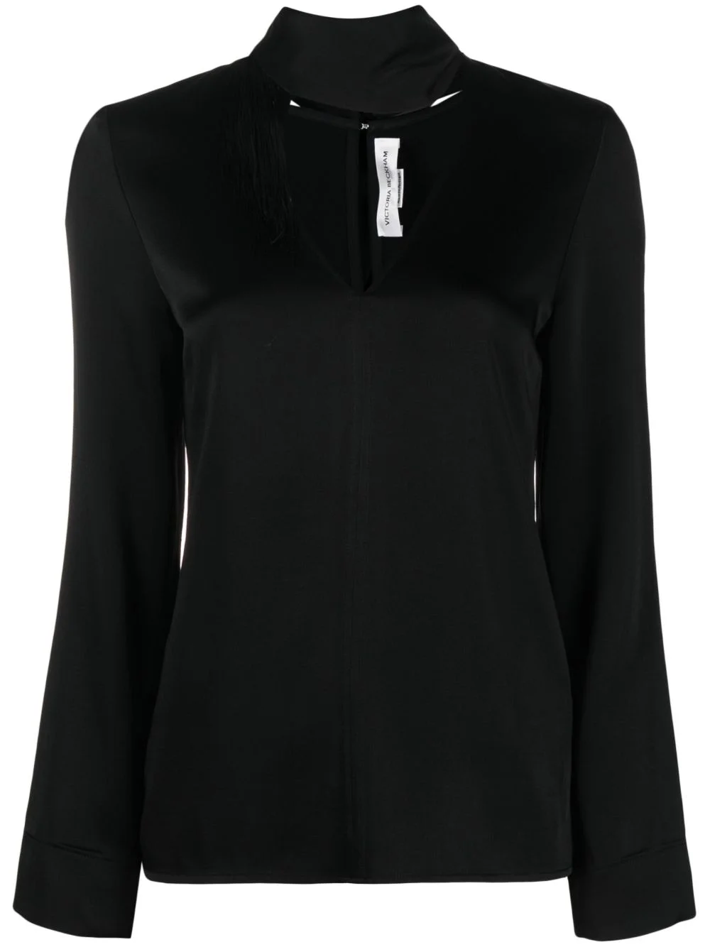 V-neck fringed satin blouse black satin finish V-neck high neck fringe detailing long sleeves straight hem rear hook and eye fastening Imported Composition Acetate 71%, Viscose 29% SIZE & FIT Model measurements Height 5 ft 11 in(1.8 m) Bust/Chest 33.07 in(84 cm) Hips 37.4 in(95 cm) Waist 25.19 in(64 cm) Washing instructions Dry Clean Only
