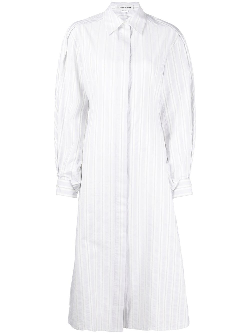vertical-stripe shirt dress off-white/grey organic cotton blend vertical stripe print classic collar concealed front button fastening long sleeves buttoned cuffs A-line Imported Composition Body: Organic Cotton 95%, Cotton 5% SIZE & FIT Model measurements Height 5 ft 10 in(1.78 m) Bust/Chest 33.07 in(84 cm) Hips 33.85 in(86 cm) Waist 25.19 in(64 cm) FittingInformation This piece fits true to size. We recommend you get your regular size Designed for a close fit at the bust and waist, but loose at the hip Made with a mid-weight fabric