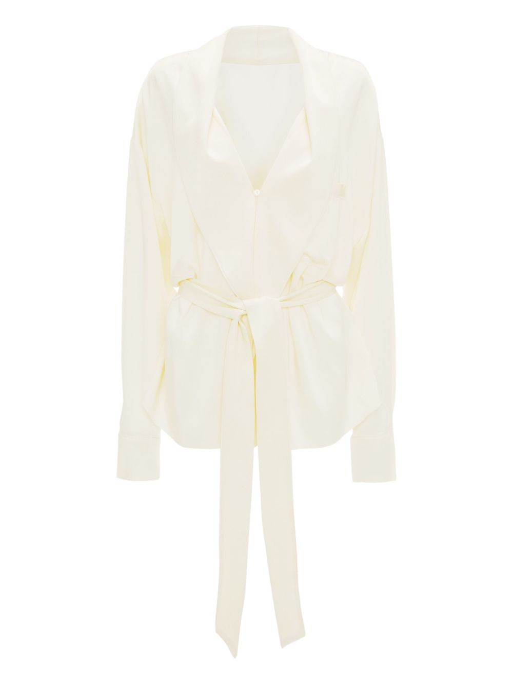 wrap-belt blouse Highlights - Ivory - Shawl collar - Self-tie belt - Long sleeves - Button front - Relaxed fit Imported Composition Acetate 71%, Viscose 29% Washing instructions Read Manufacturer Guidelines