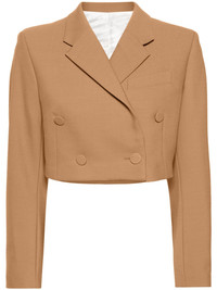 double-breasted cropped blazer Highlights - Camel brown - Twill weave - Notched lapels - Double-breasted button fastening - Shoulder pads - Long sleeves - Buttoned cuffs - Straight hem - Cropped - Chest welt pocket - Logo-jacquard lining Imported Composition Polyester 52%, Wool 43%, Elastane 5% SIZE & FIT Model measurements Height 5 ft 11 in(1.8 m) Bust/Chest 33.07 in(84 cm) Hips 37.4 in(95 cm) Waist 25.19 in(64 cm) FittingInformation Designed for a slim fit that sits just away from the body offering a close yet comfortable fit The internal shoulder pads offer a structured shape Made from a midweight fabric This piece fits true to size – take your usual size Washing instructions Dry Clean Only
