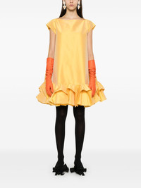 tuck-up mini dress Highlights - Dark yellow - Textured finish - Shift style - Boat neck - Sleeveless - Full lining - Ruffle hem - Thigh-length Imported Composition Polyester 69%, Silk 31% SIZE & FIT Model measurements Height 5 ft 10 in(1.78 m) Bust/Chest 33.85 in(86 cm) Hips 36.61 in(93 cm) Waist 26.77 in(68 cm) FittingInformation Designed for an oversized fit, offering additional room throughout Made from a midweight non-stretch fabric Washing instructions Dry Clean Only