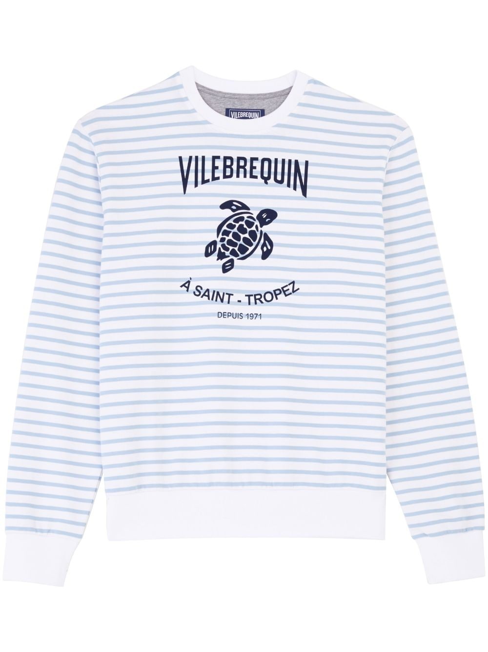 logo-print striped sweatshirt Highlights - Light blue/white - Navy blue - Stretch-cotton - Jersey texture - Horizontal stripe print - Logo print to the front - Crew neck - Long sleeves - Ribbed cuffs and hem Made in Italy Composition Cotton 95%, Elastane 5%