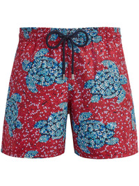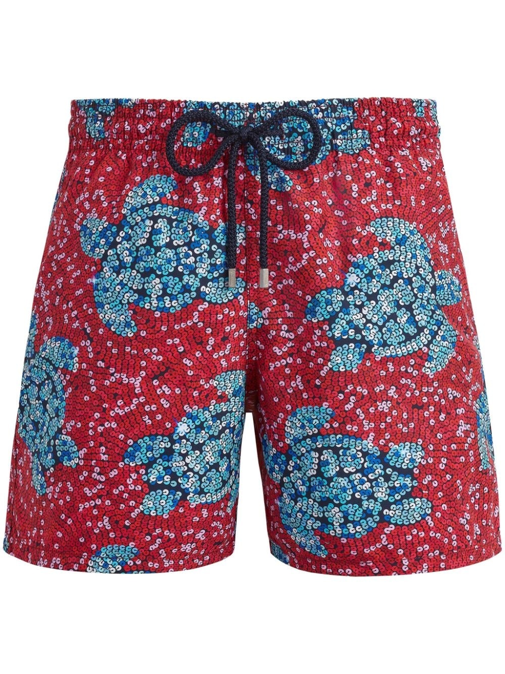 turtle-print swim shorts Highlights - Dark red/sky blue/black - Recycled polyester - Turtle and sequin print - Elasticated waistband - Logo tag - Rear flap pocket - Internal mesh briefs - Drawstring fastening - Be mindful to try on swimwear over your own garments. Imported Composition Recycled Polyester 100%