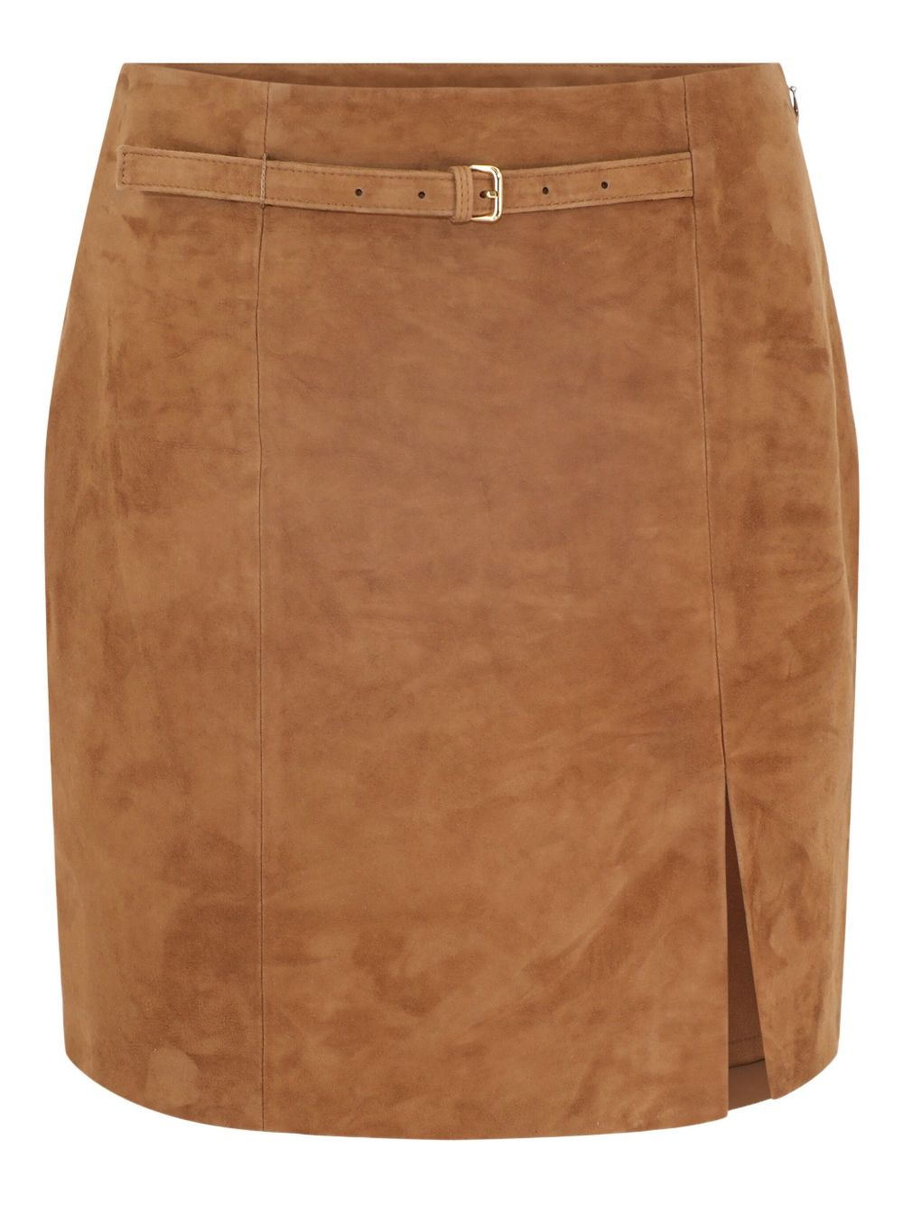 belted suede skirt Highlights - Brown - Suede - Side zip fastening - Straight hem - Side slit - Belt detail Imported Composition Suede 100% Washing instructions Read Manufacturer Guidelines