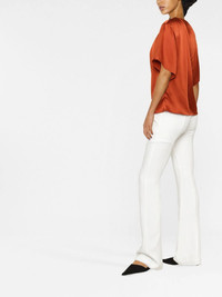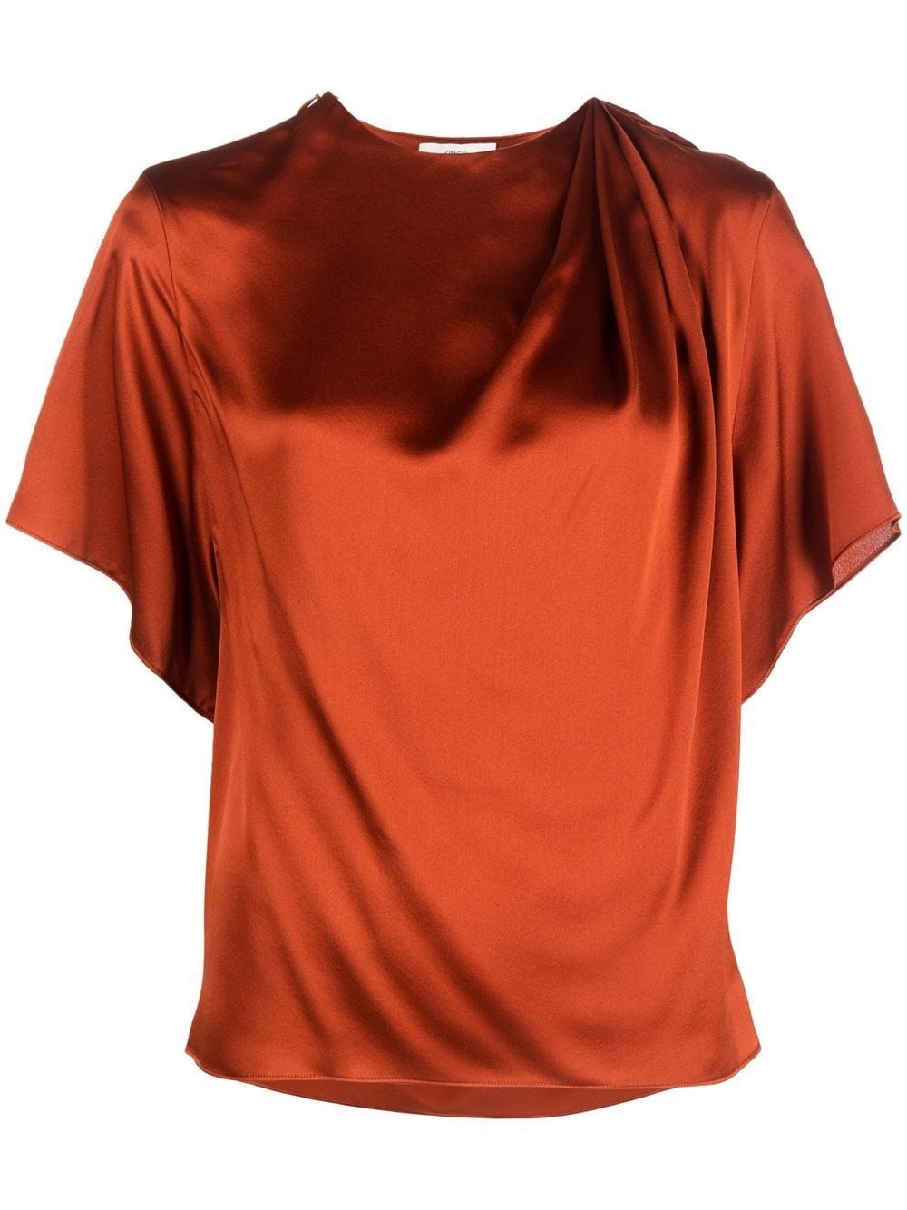 draped silk top rust brown silk draped design round neck short sleeves straight hem Imported Composition Silk 100% SIZE & FIT Model measurements Height 5 ft 10 in(1.78 m) Bust/Chest 30.31 in(77 cm) Hips 36.61 in(93 cm) Waist 24.8 in(63 cm) FittingInformation This piece fits true to size. We recommend you get your regular size Cut for a loose fit Made with a lightweight non-stretch fabric Washing instructions Hand Wash