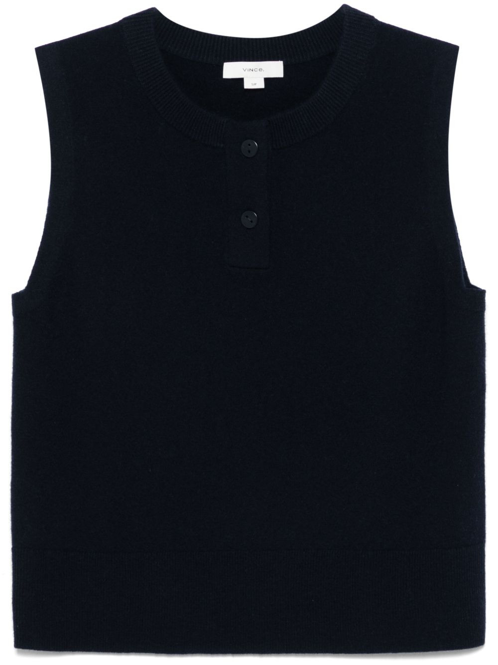 Henley vest Highlights - Navy blue - Front button placket - Crew neck - Sleeveless - Ribbed hem Imported Composition Wool 54%, Cashmere 35%, Polyester 11% SIZE & FIT Model measurements Height 5 ft 11 in(1.8 m) Bust/Chest 31.49 in(80 cm) Hips 36.61 in(93 cm) Waist 24.4 in(62 cm) FittingInformation Designed for a relaxed fit, this piece allows for comfort and movement when worn Made with a midweight knit, this piece offers some stretch Washing instructions Hand Wash