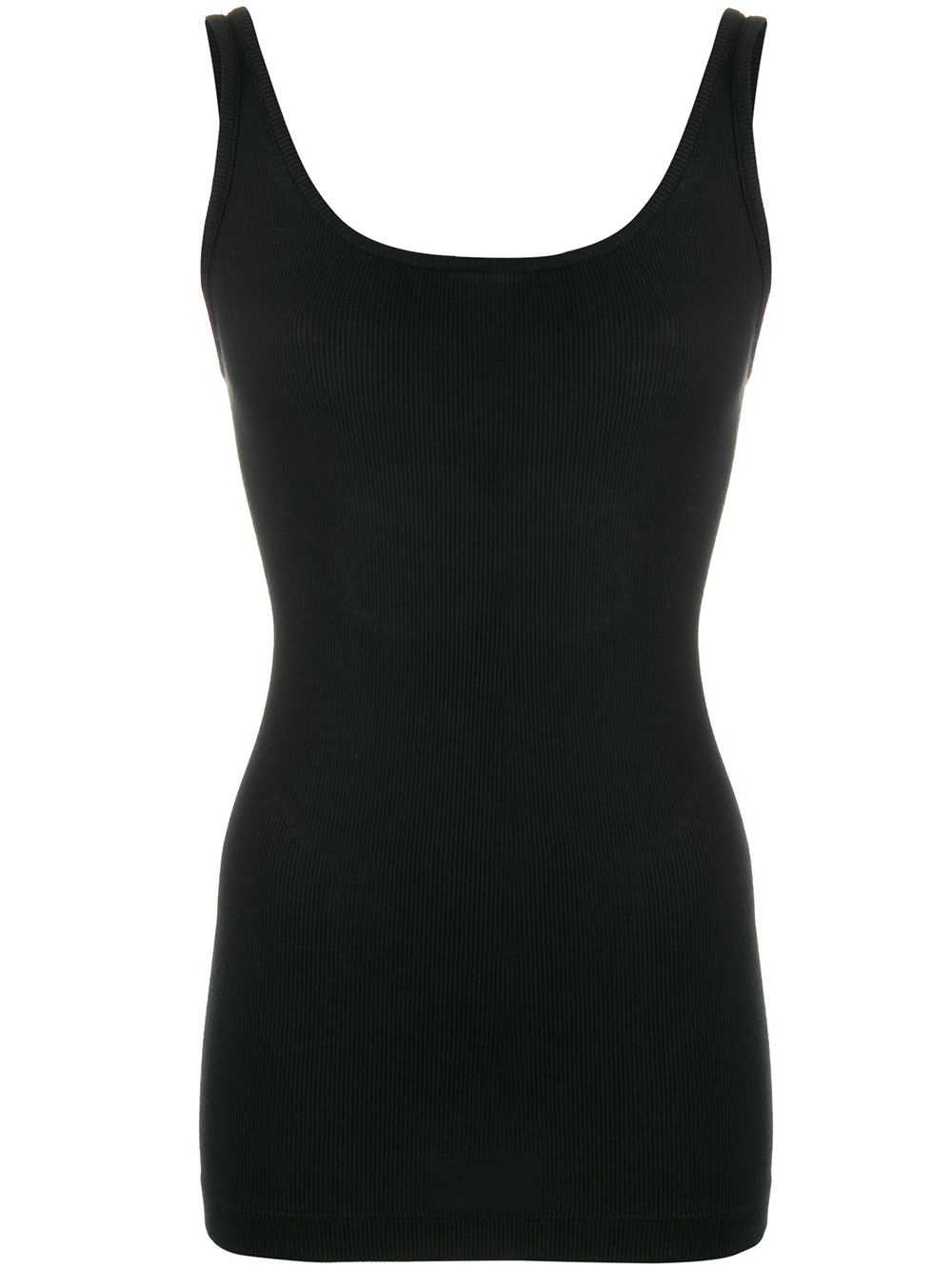 ribbed tank top Black pima stretch cotton blend ribbed tank top from Vince featuring a scoop neck, a stretch fit, a sleeveless design and a slim fit. Imported Composition Modal 50%, Pima Cotton 50% SIZE & FIT Model measurements Height 5 ft 11 in(1.8 m) Bust/Chest 31.88 in(81 cm) Hips 35.03 in(89 cm) Waist 24.01 in(61 cm) FittingInformation This piece fits true to size. We recommend you get your regular size Cut for a slim fit Made with a lightweight fabric Washing instructions Machine Wash