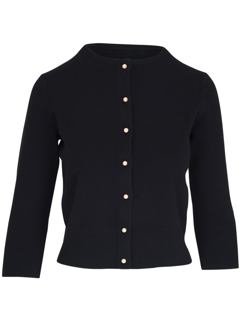 round-neck cardigan Highlights - Jet black - Wool blend - Knitted construction - Round neck - Front button fastening - Faux-pearl buttons - Three-quarter length sleeves - Ribbed cuffs and hem Made in United States Composition Wool 67%, Cashmere 28%, Nylon 4%, Spandex/Elastane 1%