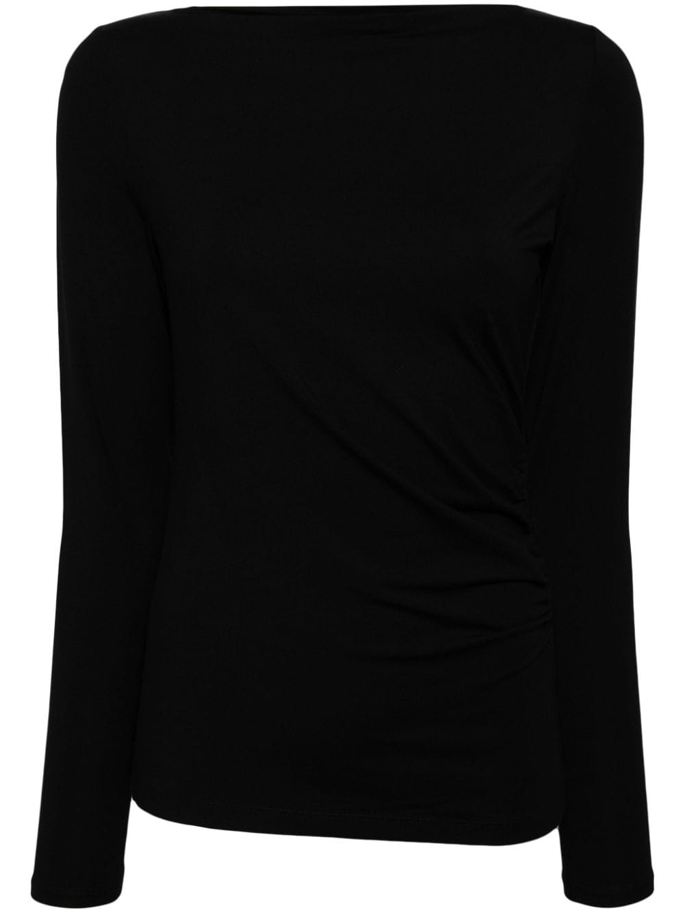 ruched long-sleeve top Highlights - Black - Stretch-design - Ruched detailing - Boat neck - Long sleeves - Straight hem Imported Composition Rayon 92%, Spandex/Elastane 8% SIZE & FIT Model measurements Height 5 ft 10 in(1.77 m) Bust/Chest 31.49 in(80 cm) Hips 35.43 in(90 cm) Waist 25.19 in(64 cm) FittingInformation Designed for a slim fit that sits just away from the body offering a close yet comfortable fit Made from a midweight stretch fabric, this piece offers elasticity and flexibility when worn This piece fits close in all sizes – take your usual size