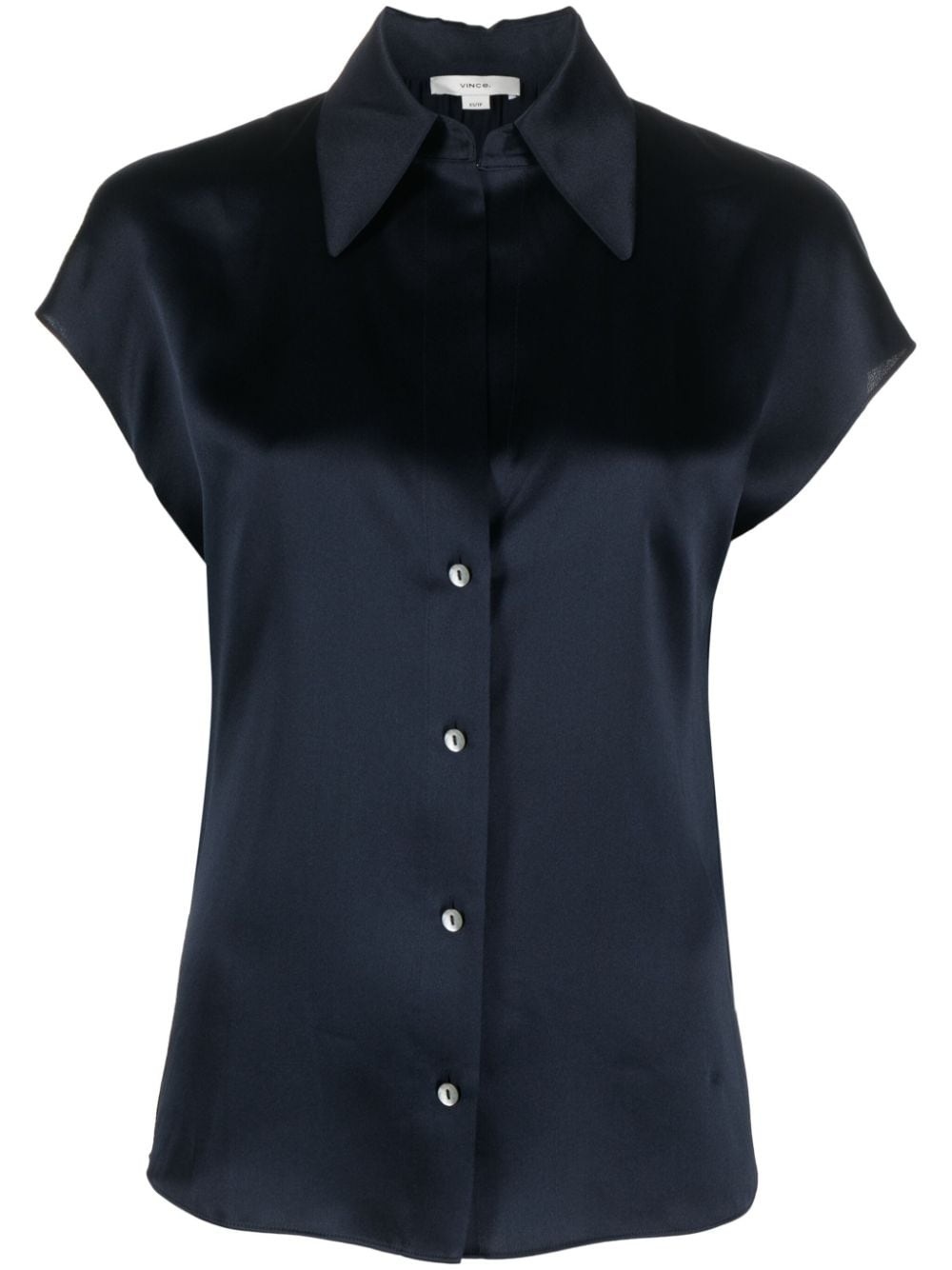 short-sleeve silk shirt Highlights - Navy blue - Silk satin - Classic collar - Front button fastening - Cap sleeves - Straight hem Imported Composition Silk 100% SIZE & FIT Model measurements Height 5 ft 10 in(1.78 m) Bust/Chest 33.46 in(85 cm) Hips 36.22 in(92 cm) Waist 23.22 in(59 cm) Measurement CHEST 46.45 in(118 cm) LENGTH 26.37 in(67 cm) HIPS 46.45 in(118 cm) FittingInformation Designed to be unstructured, offering a loose fit throughout Made from a lightweight non-stretch fabric This piece fits true to size – take your usual size